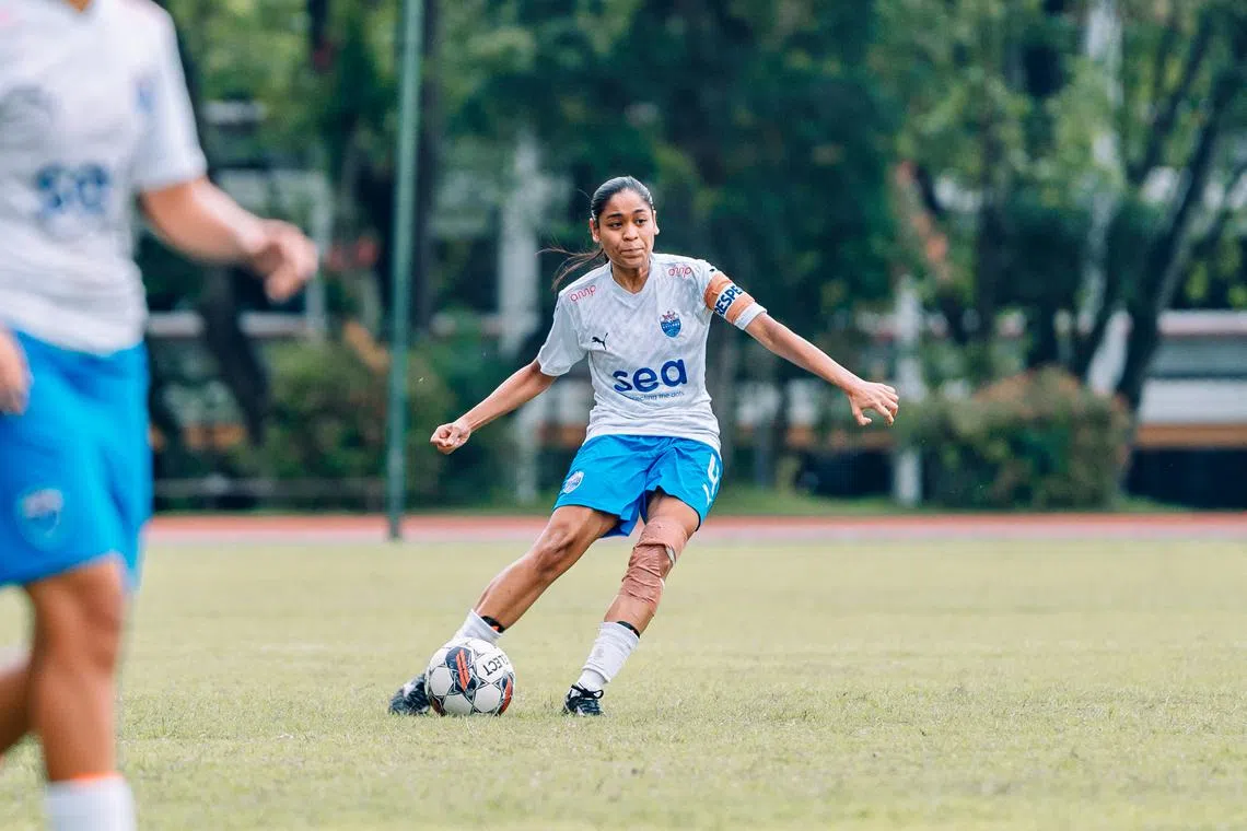 Team captain Umairah Hamdan, 22, in action at the Women's Premier League match against BG Tampines Rovers on May 18 at Choa Chu Kang Stadium.