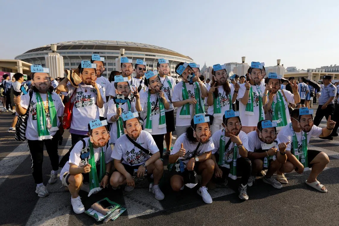 People wearing face masks of Argentina soccer player Lionel Messi outside Workers’ Stadium in Beijing, on June 15, 2023.