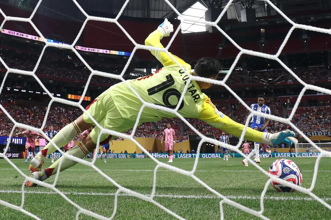 Porto’s Samu Aghehowa scoring his team’s first goal from the penalty spot, past Inter Miami’s Oscar Ustari.