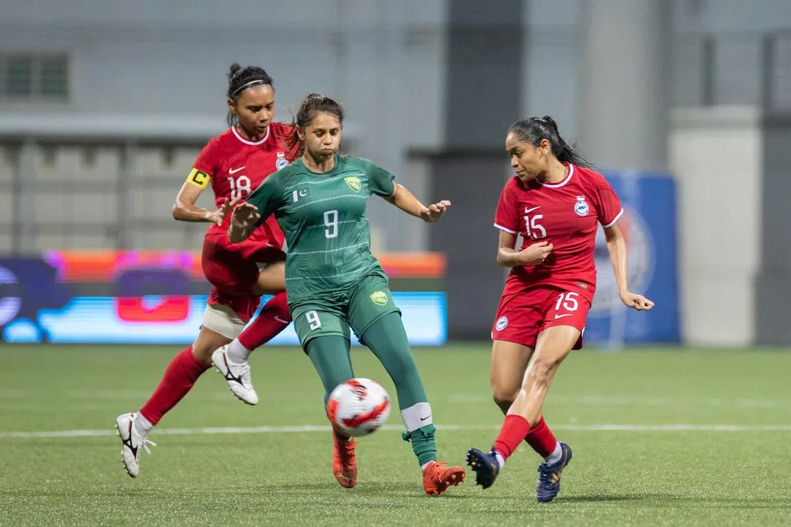 Singapore captain Siti Rosnani Azman and fellow centre-back Umairah Hamdan tussling for the ball with Pakistan's Zahmena Malik in their friendly at the Jalan Besar Stadium on Tuesday. PHOTO: FOOTBALL ASSOCIATION OF SINGAPORE