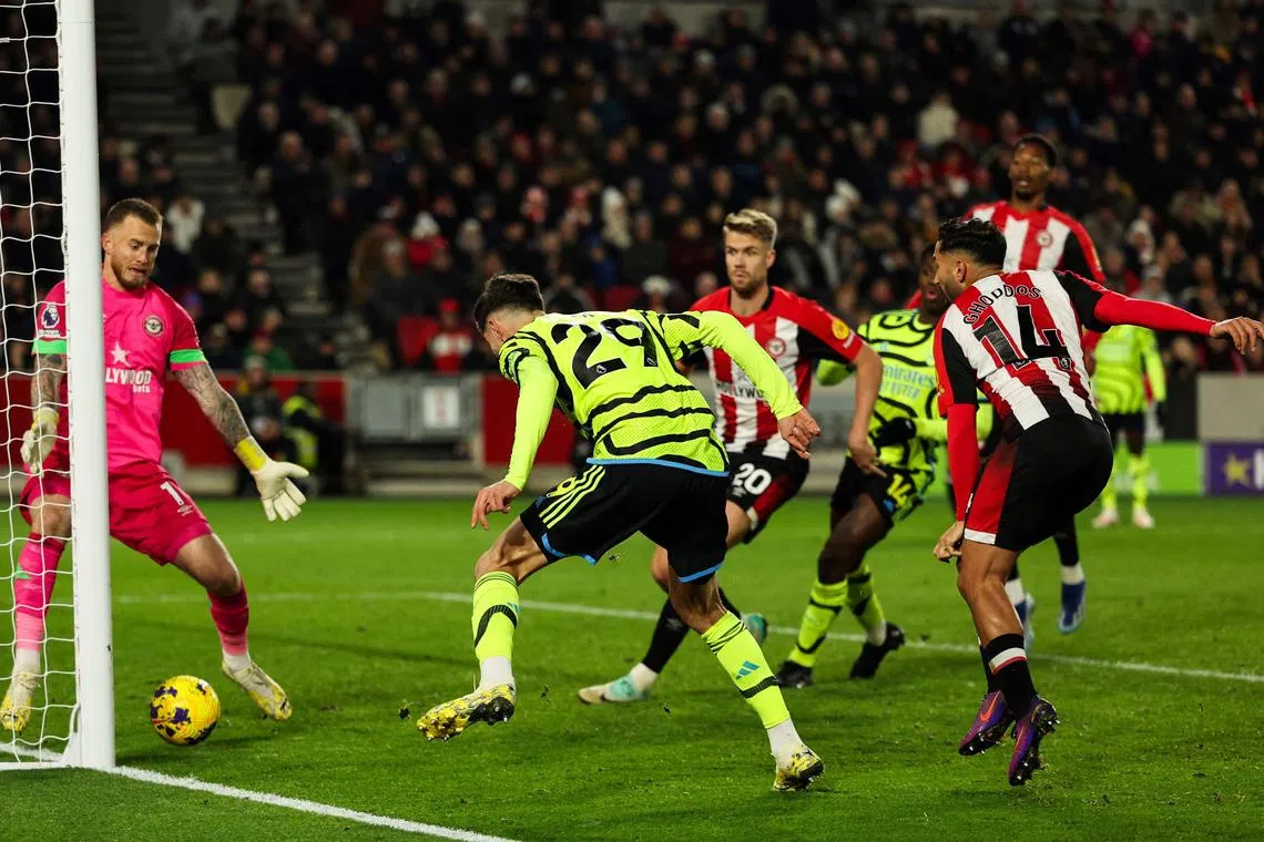 Arsenal’s Kai Havertz scores past Brentford goalkeeper Mark Flekken.