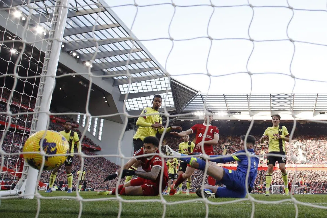 Liverpool’s Luis Diaz scores their second goal past Burnley’s James Trafford.
