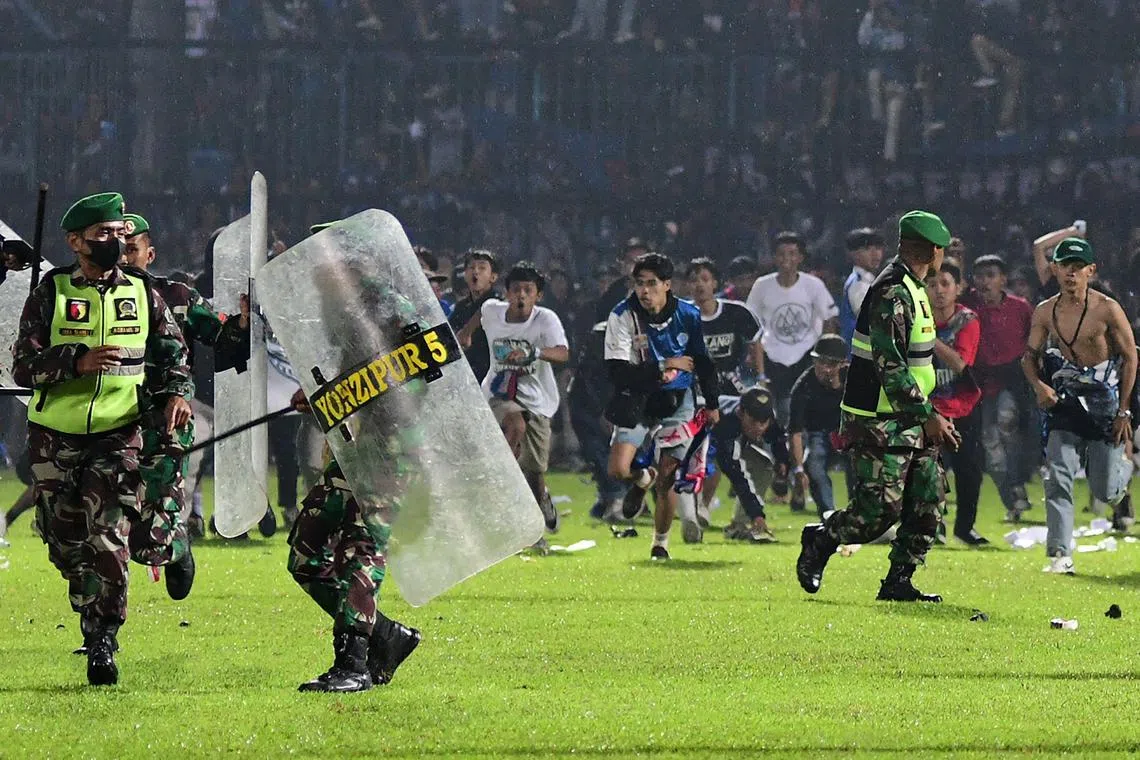 Soccer fans enter the pitch as military personnel try to stop them during a riot following a match at Kanjuruhan Stadium in Malang, Indonesia, on Oct 1, 2022.