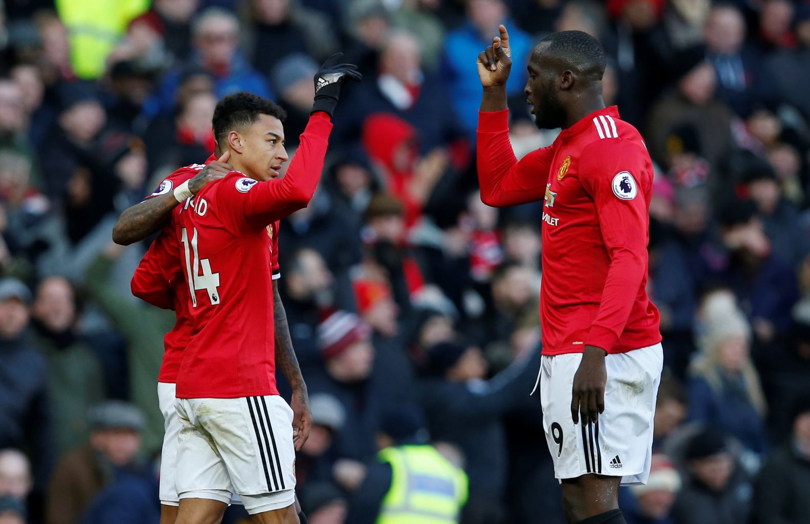 Jesse Lingard celebrates with Romelu Lukaku after scoring their second goal.