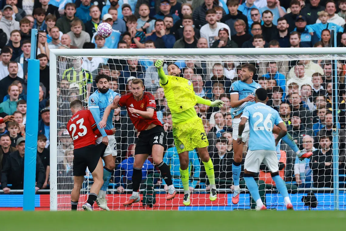 Manchester City's Gianluigi Donnarumma in action with Manchester United's Matthijs de Ligt.