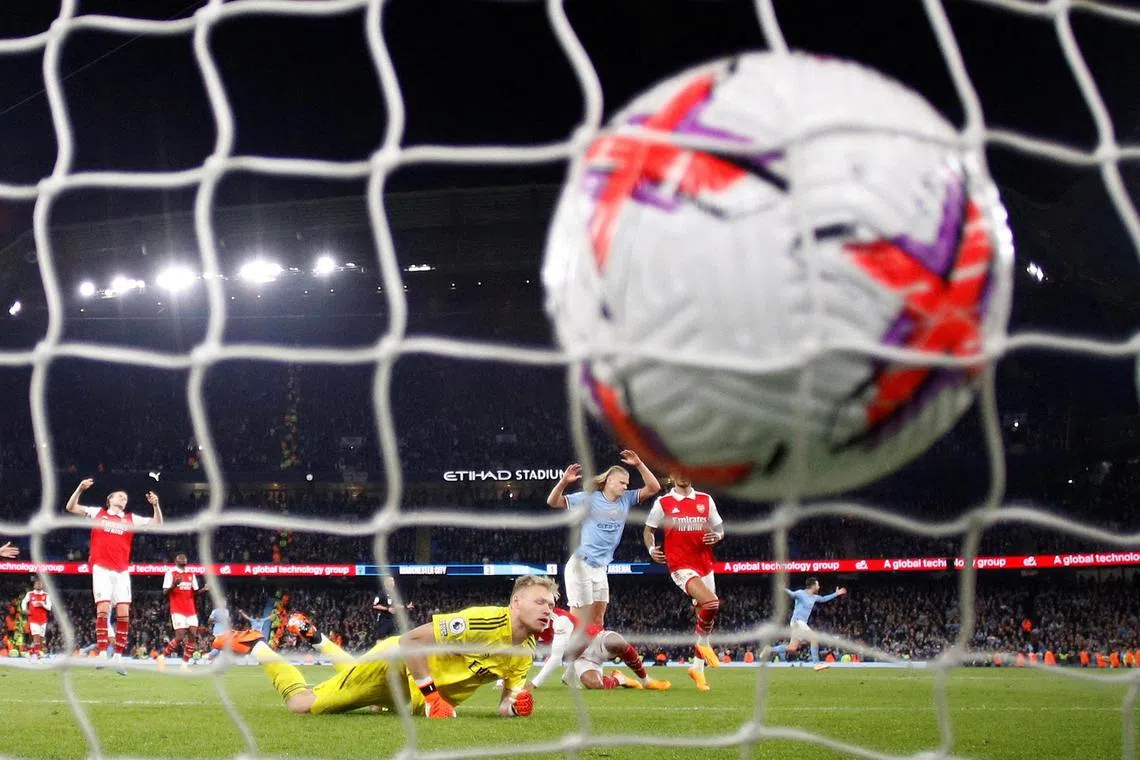 Manchester City’s Erling Haaland scores their fourth goal past Arsenal’s Aaron Ramsdale.