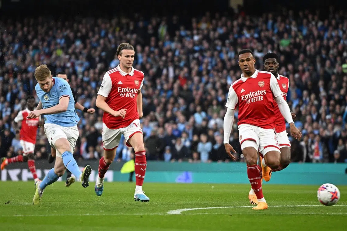 De Bruyne fired City ahead in the seventh minute and the hosts bombarded Arsenal’s goal before John Stones deservedly doubled their lead with a header in first half stoppage time.