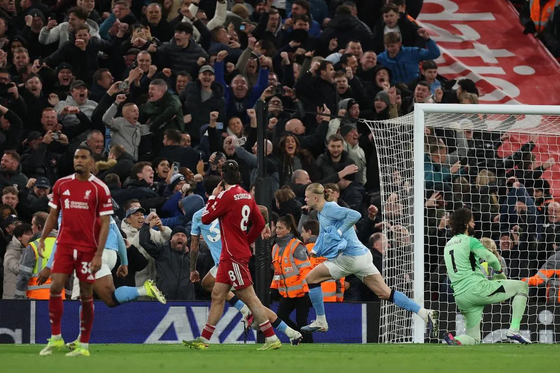Manchester City's striker Erling Haaland (centre) scores his team's second goal in Liverpool, England, on Feb 8.