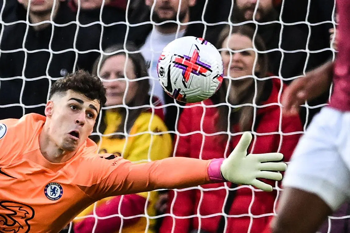 Chelsea goalkeeper Kepa Arrizabalaga fails to stop Aston Villa’s second goal, scored by Villa midfielder John McGinn (unseen).