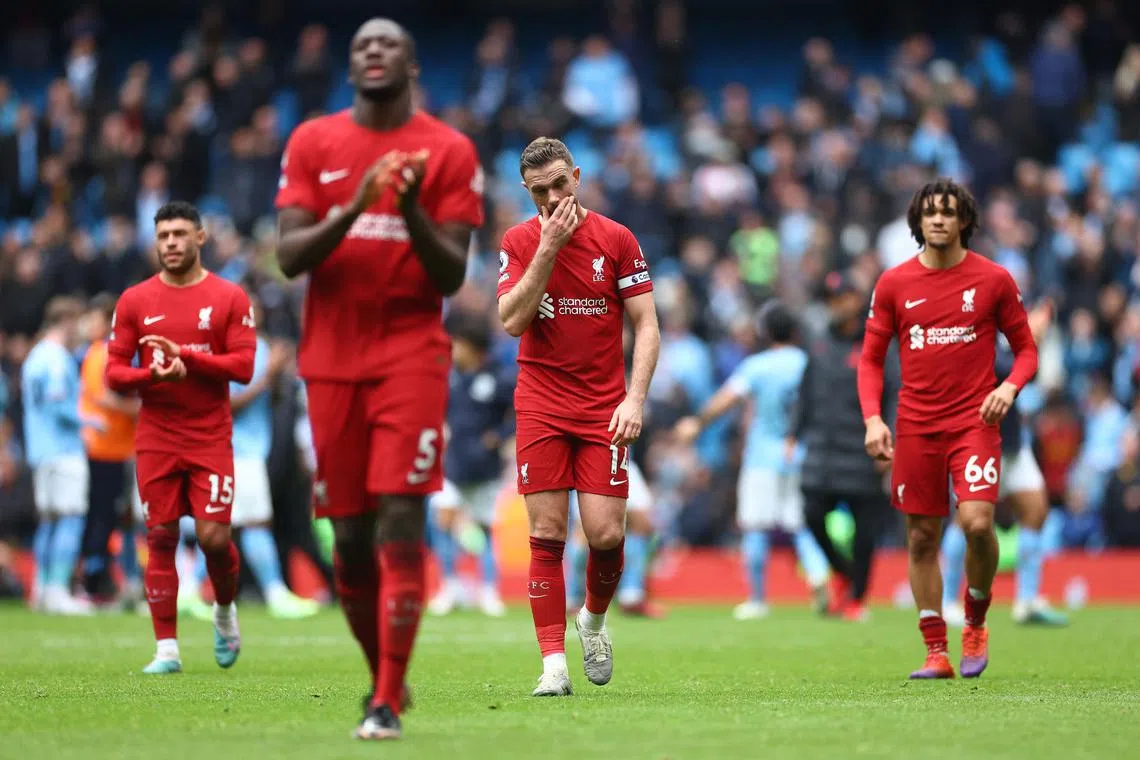 Liverpool’s Trent Alexander-Arnold and Jordan Henderson look dejected after their 4-1 loss to Manchester City.