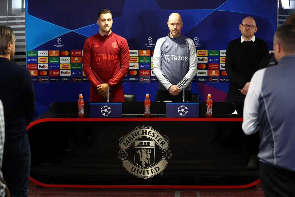 Manchester United’s Diogo Dalot and manager Erik ten Hag hold a minute’s silence in memory of former player Bobby Charlton.
