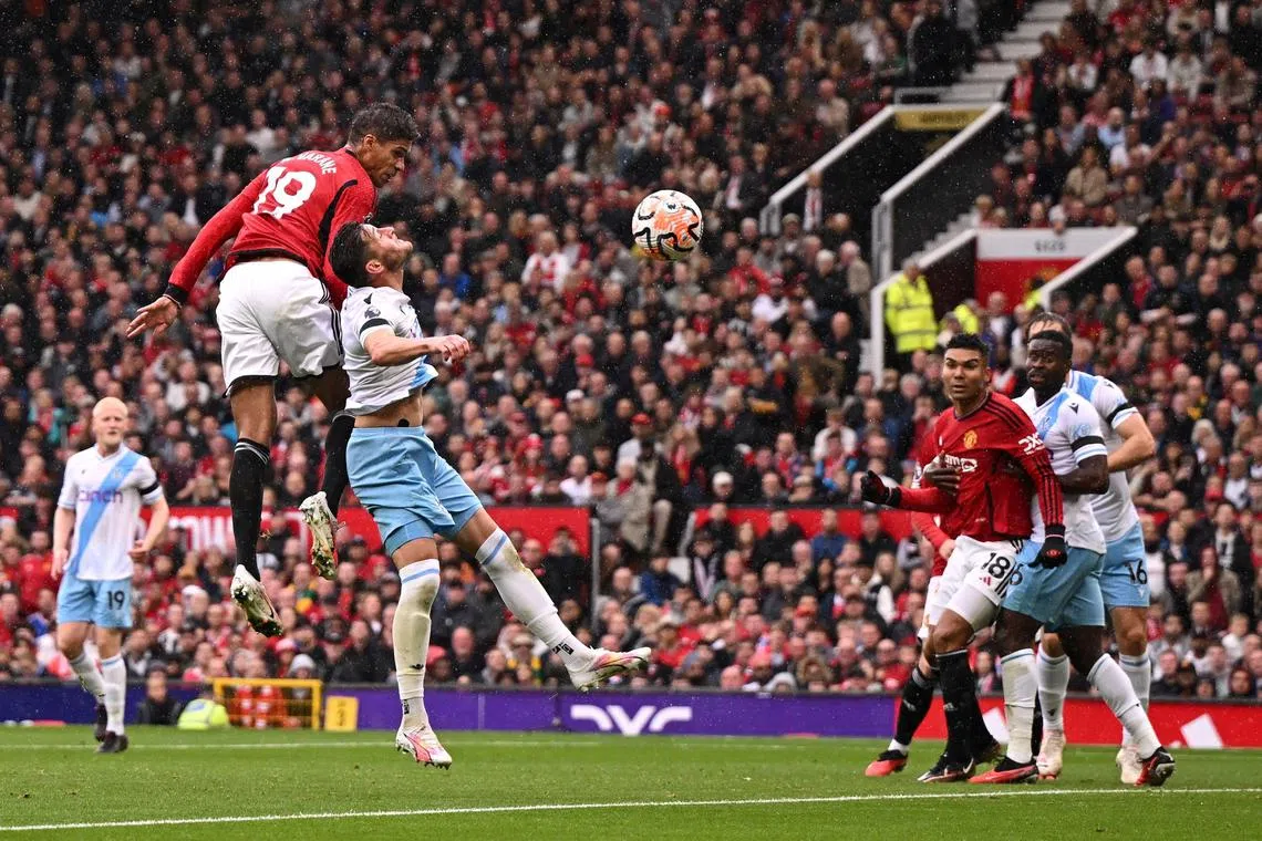 Manchester United’s Raphael Varane heads the ball but fails to score.