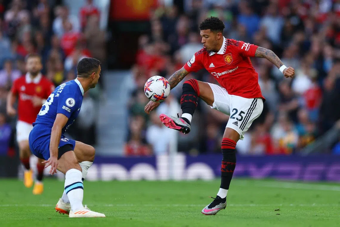Manchester United’s Jadon Sancho in action with Chelsea’s Cesar Azpilicueta.