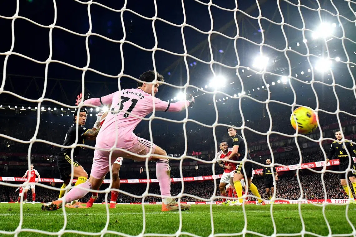 Manchester United's Lisandro Martinez scores an own goal and Arsenal's first.
