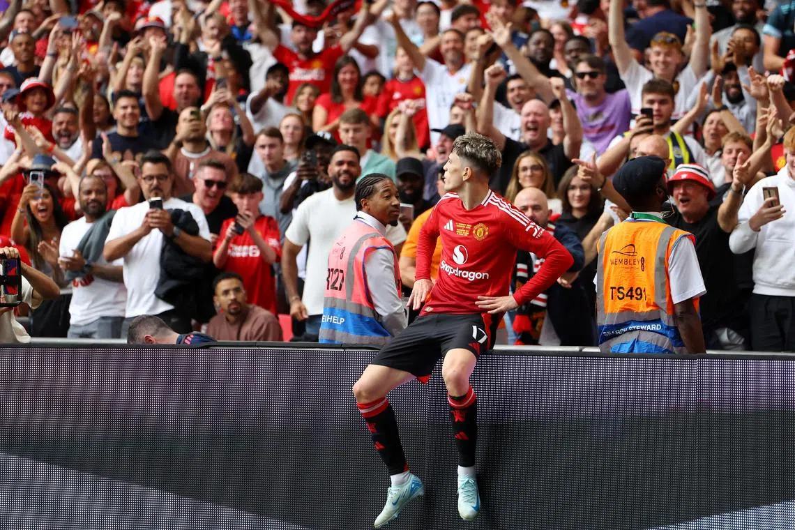 Manchester United's Alejandro Garnacho celebrates after scoring against City.