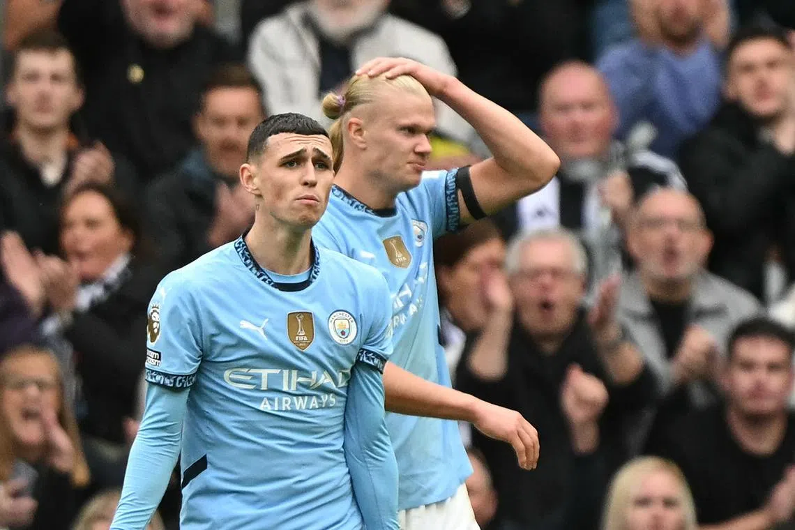 Manchester City’s Phil Foden (left) and Erling Haaland reacting to a missed chance against Newcastle.