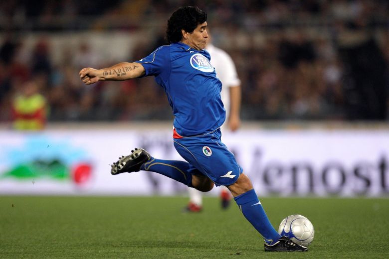Diego Maradona in action during a charity football match called "Derby of the Heart" in Rome, on May 12, 2008.