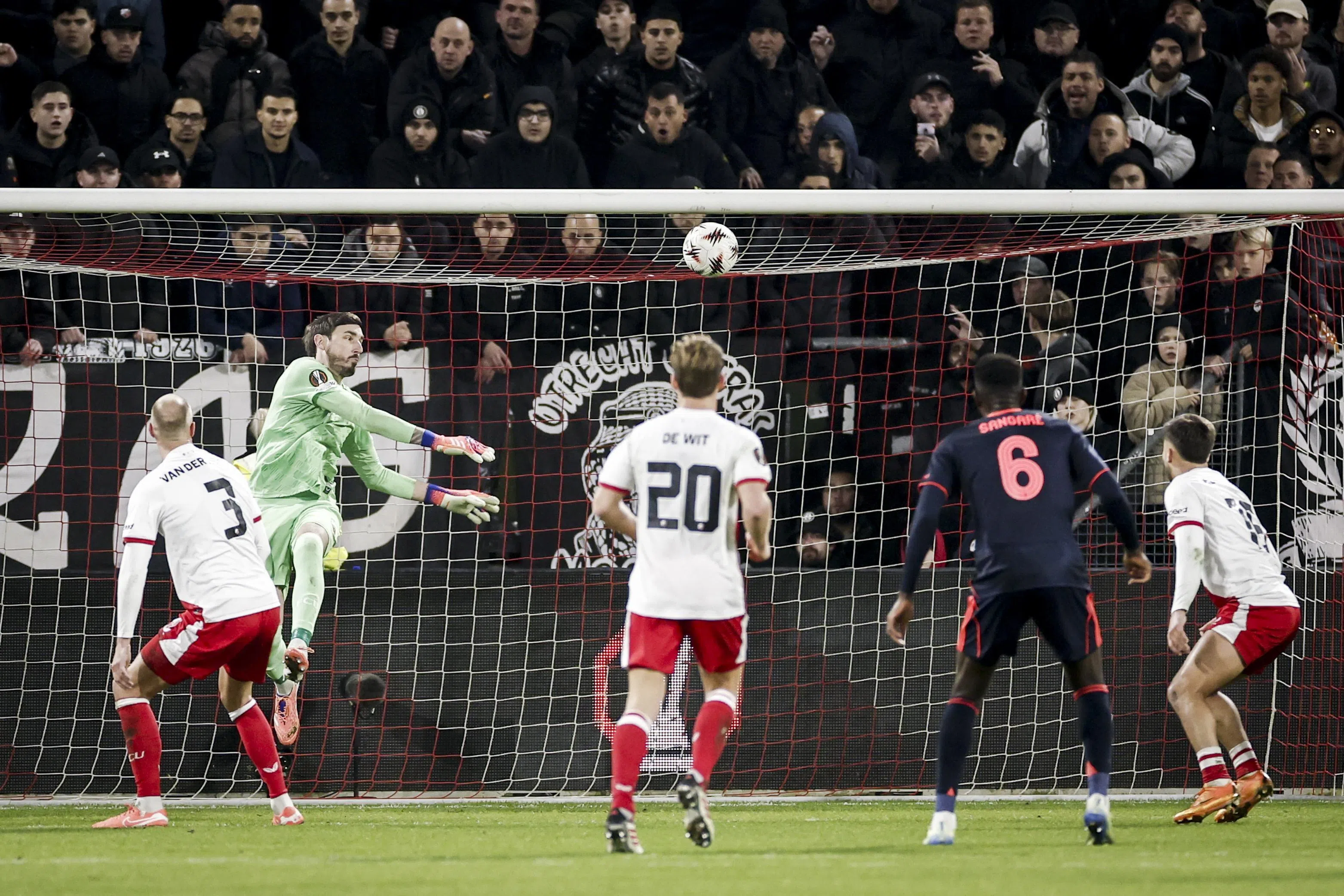 Nottingham Forest's Igor Jesus (not seen) scores their second, winning goal against Utrecht.