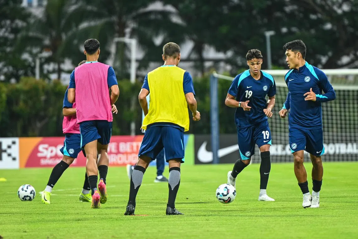 Ilhan Fandi (second from right) during Singapore’s training session on June 4, 2025, ahead of the international friendly match between Singapore and Maldives at the Bishan Stadium on June 5.