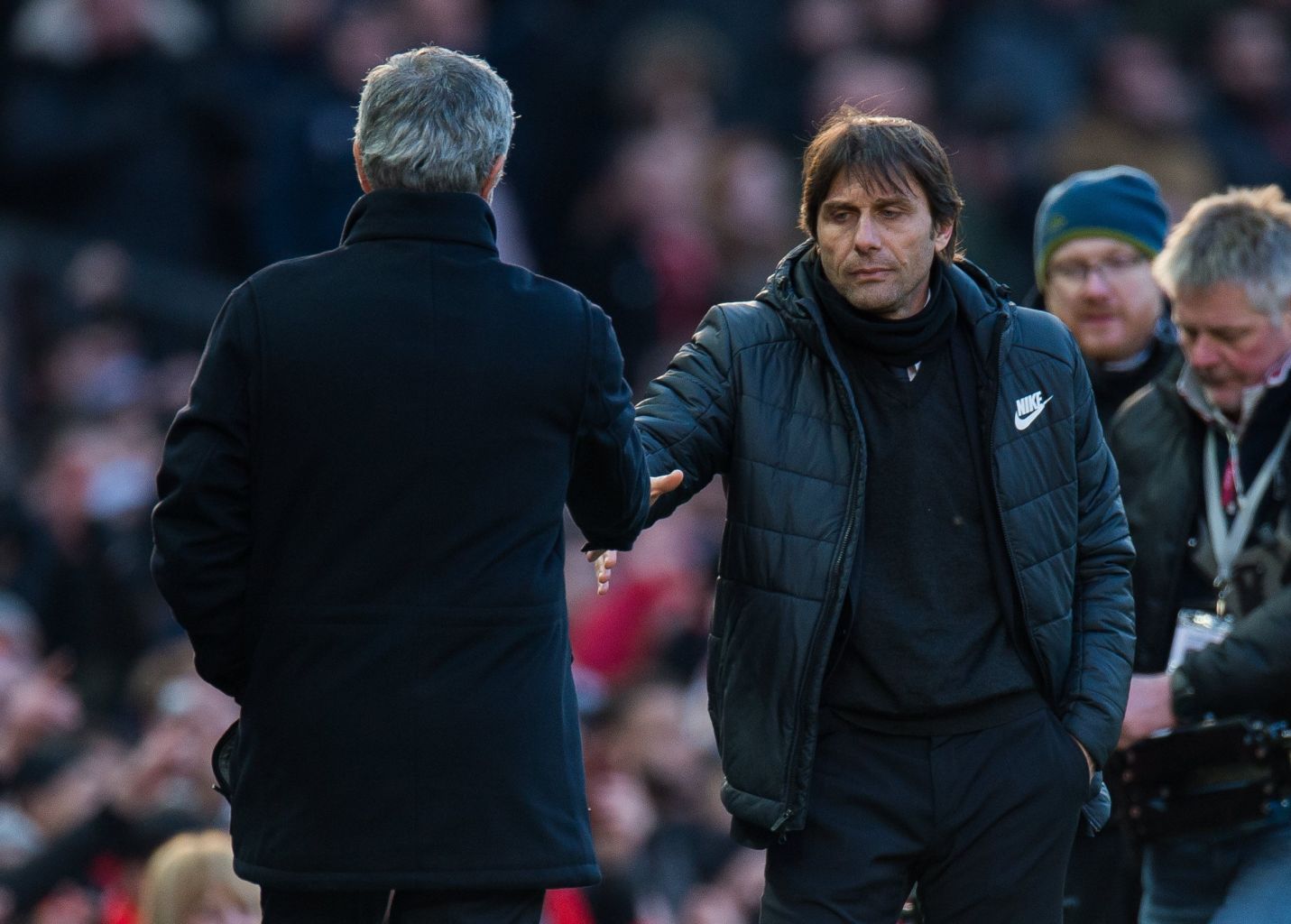 Antonio Conte (right) and Jose Mourinho shake hands after the match.
