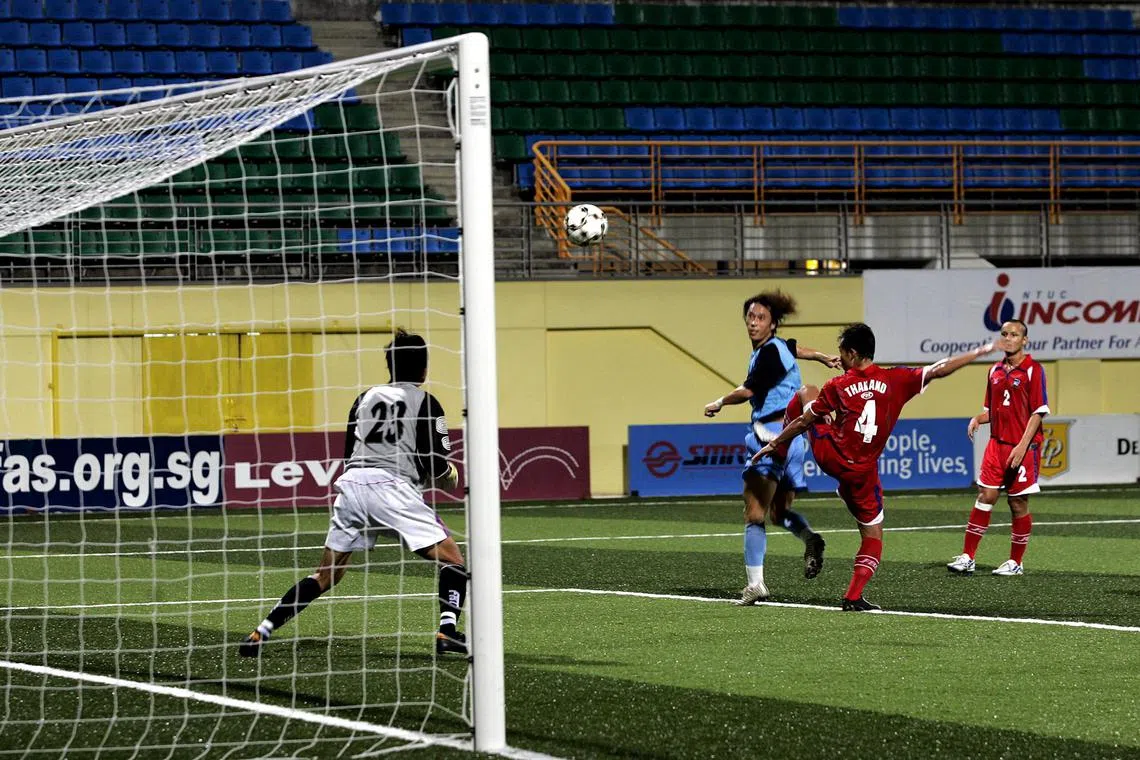 S.League Selection’s Park Tae-won attempting a header in an exhibition match against Thailand All Stars on Nov 13, 2005. This was the first official match at Jalan Besar Stadium since the natural grass surface was replaced with an artificial pitch that year.