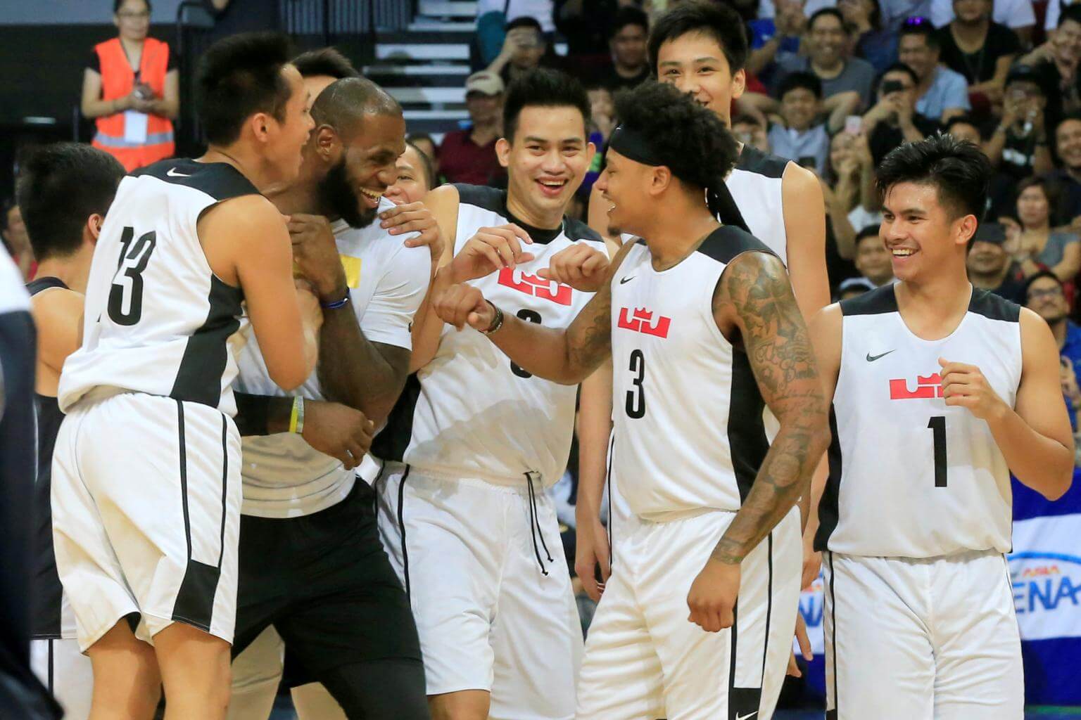 Basketballer LeBron James of Cleveland Cavaliers celebrates with Gilas Pilipinas team after an exhibition game with members of the Philippine Basketball Association (PBA) team, in Manila, Philippines on Sept 2, 2017.
