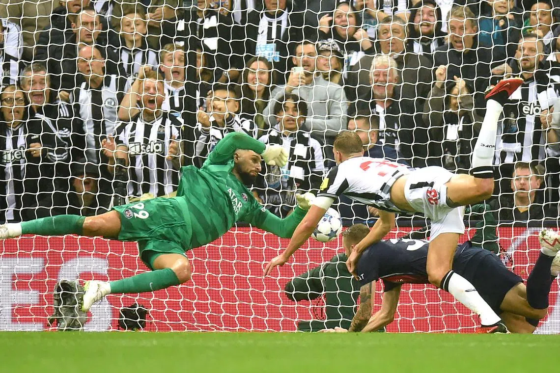 Dan Burn (right) scores against PSG goalkeeper Gianluigi Donnarumma.