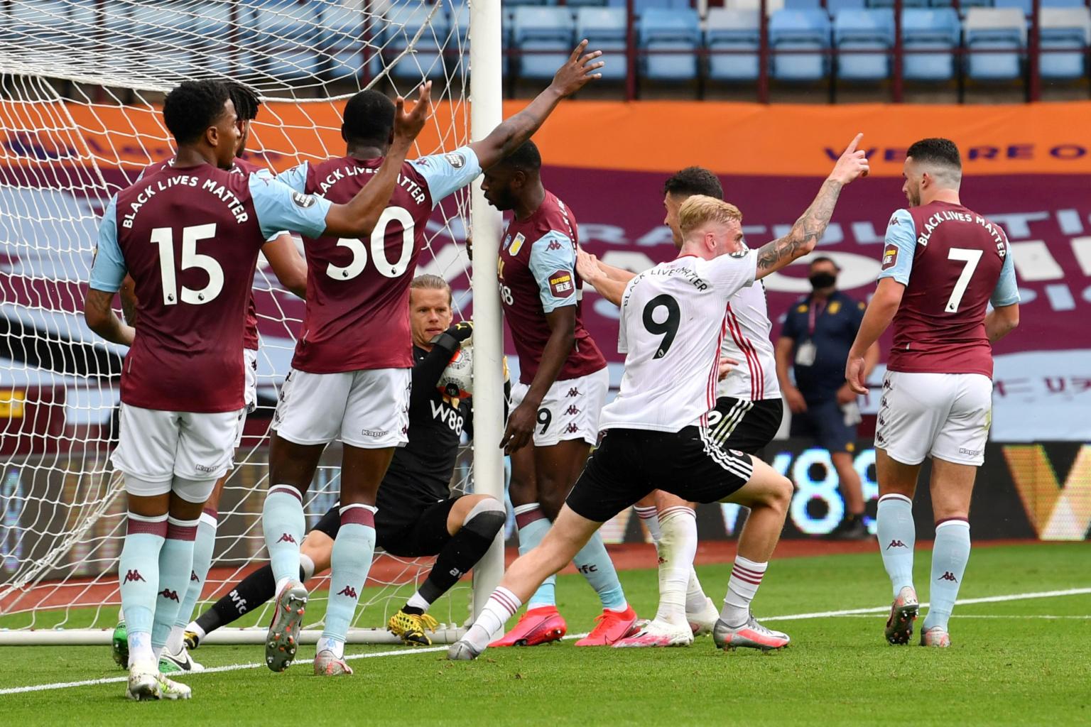 Aston Villa's Orjan Nyland appears to carry the ball over the goal line however a goal is not awarded.