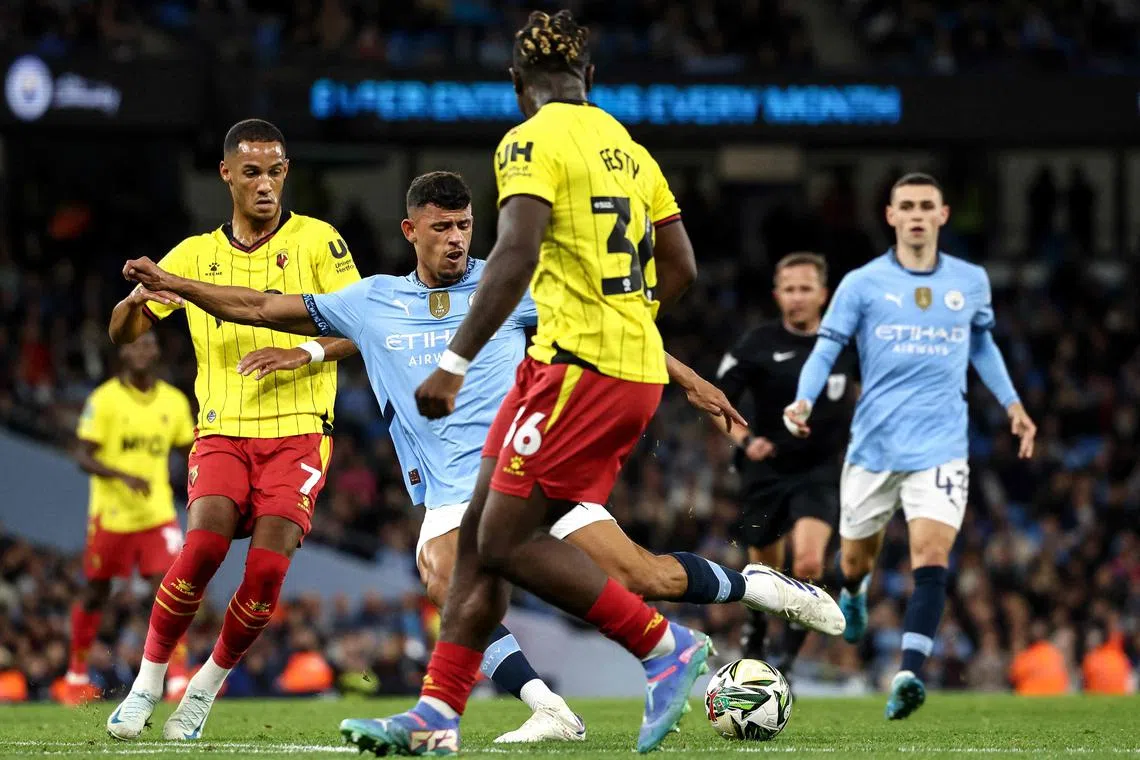 Manchester City’s Portuguese midfielder Matheus Nunes scores the team’s winning goal against Watford.
