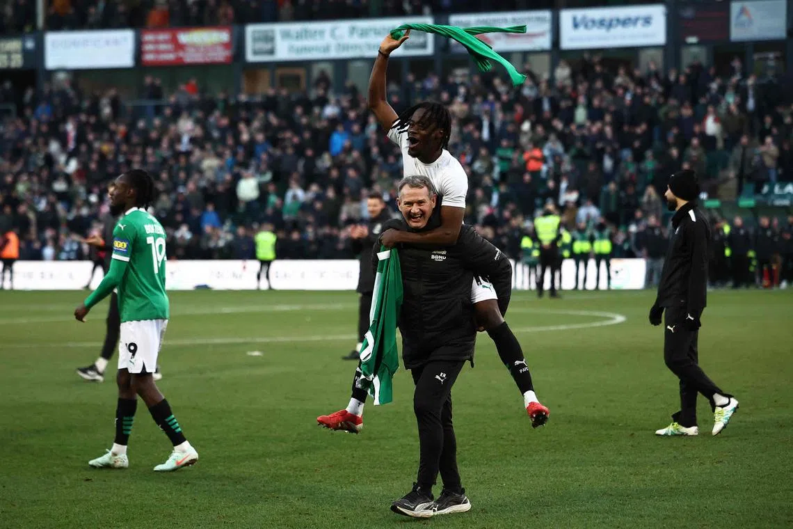 Plymouth Argyle midfielder Darko Gyabi celebrating with first-team coach Kevin Nancekivell after the English FA Cup fourth-round win over Liverpool.