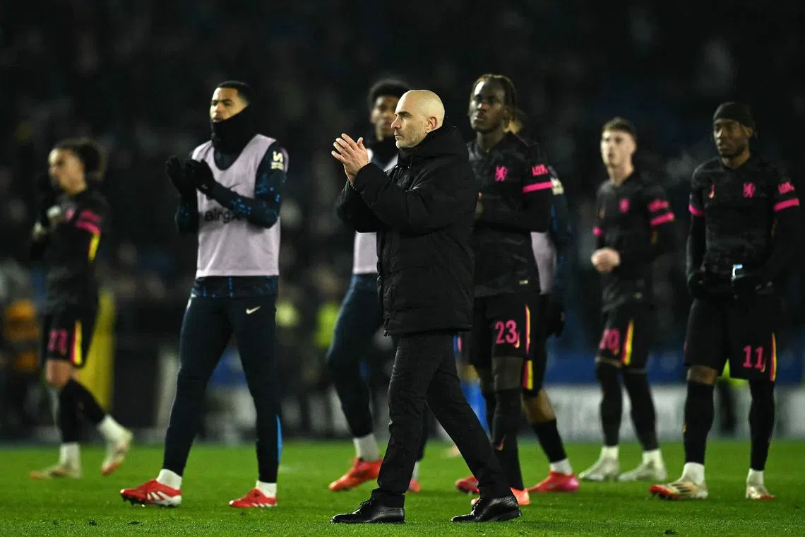 Chelsea manager Enzo Maresca applauding their fans after a 2-1 loss to Brighton & Hove Albion in an FA Cup fourth-round match on Feb 8.