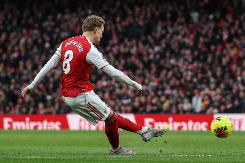 Arsenal's Norwegian midfielder Martin Odegaard scores the team's first goal.