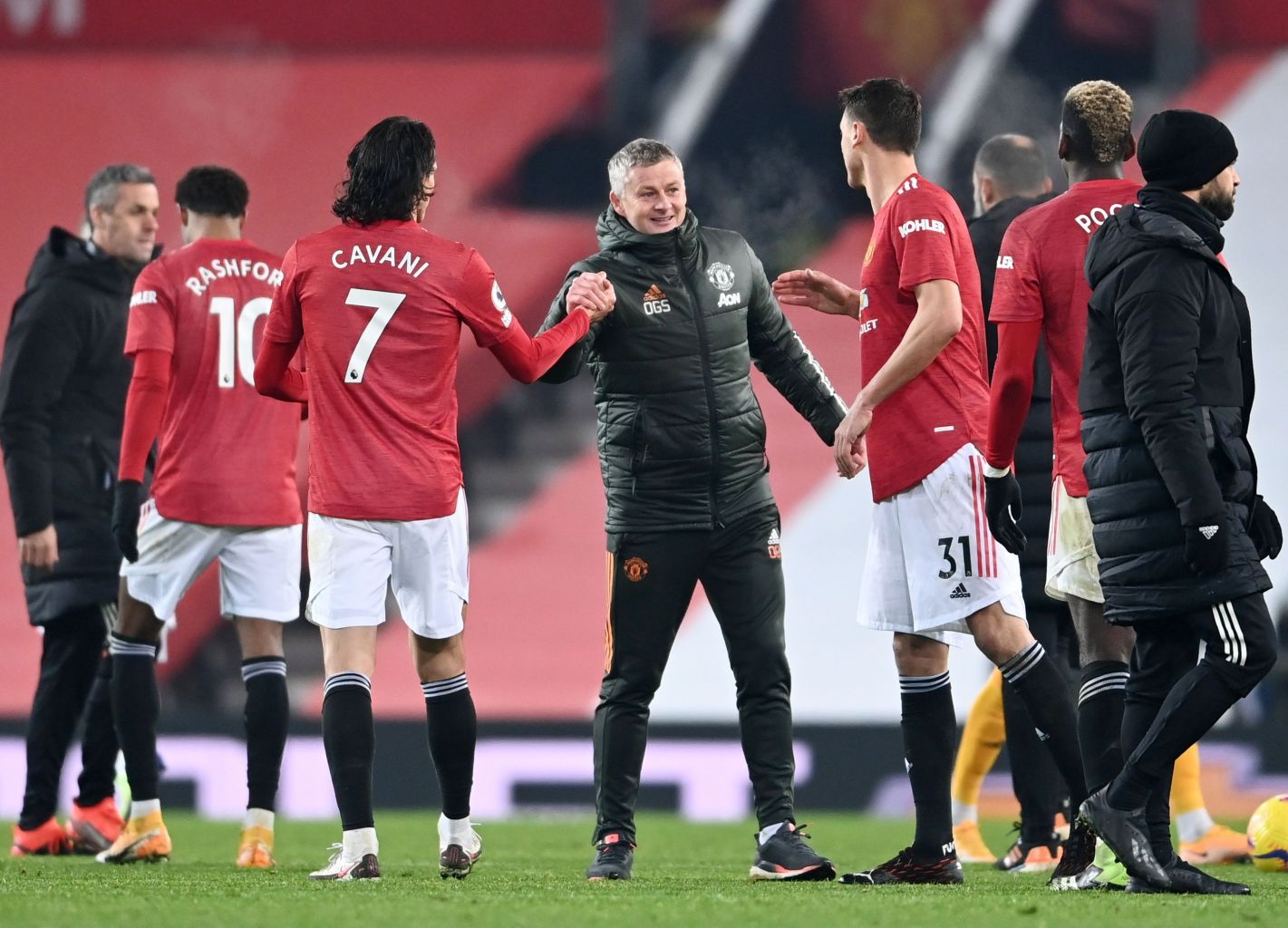 United manager Ole Gunnar Solskjaer, and players Nemanja Matic and Edinson Cavani celebrate after a match.