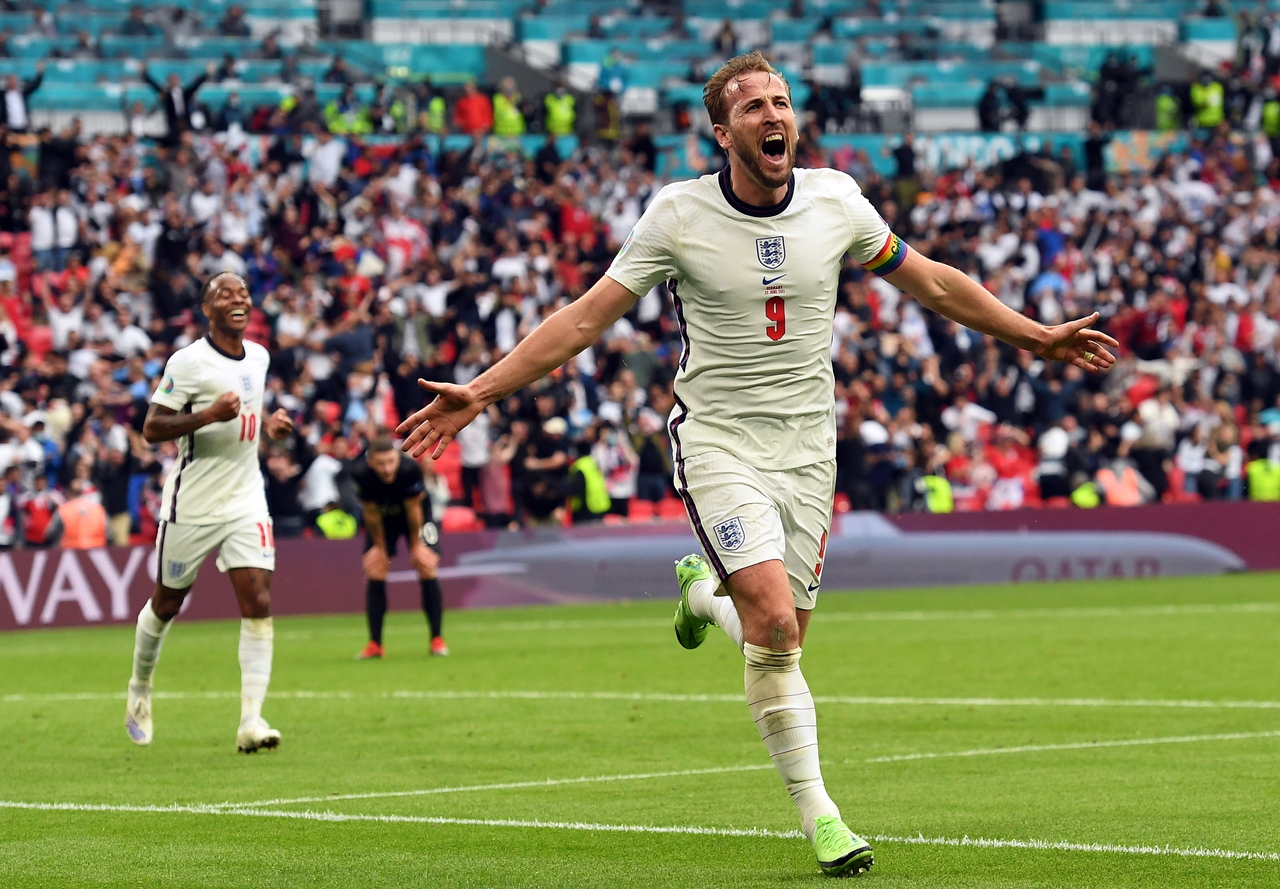England's Harry Kane celebrates scoring the 2-0 goal during the UEFA Euro 2020 match with Germany on June 29, 2021.