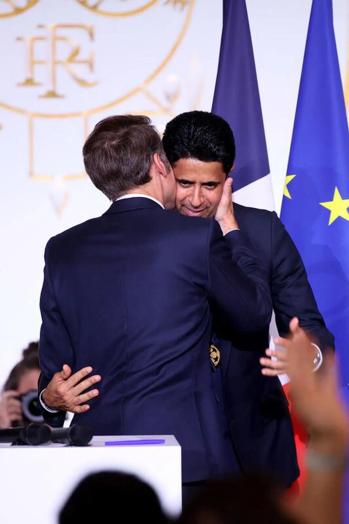 France’s President Emmanuel Macron kisses Paris St Germain’s president Nasser al-Khelaifi (right) during the reception at the Elysee presidential palace in Paris on June 1.