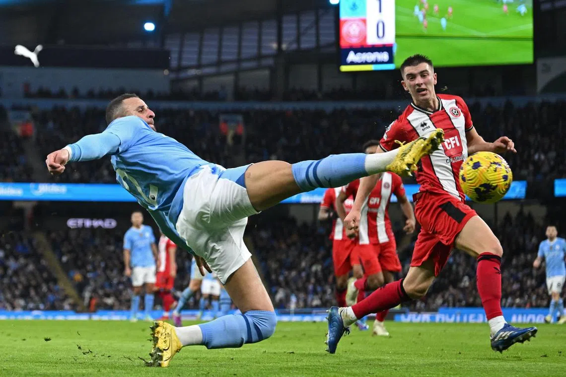 Manchester City's Kyle Walker stretches for the ball during the Premier League match against Sheffield United.