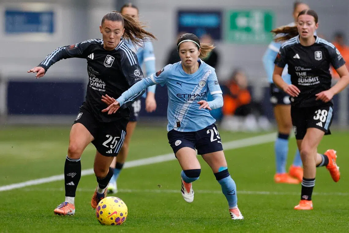 Manchester City's Japanese midfielder Yui Hasegawa and Aston Villa's Scottish midfielder Miri Taylor in action during a Women's Super League match at the Manchester City Academy Stadium on Dec 14, 2025.