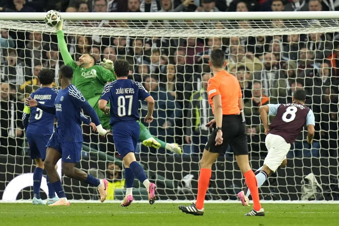 PSG goalkeeper Gianluigi Donnarumma making a save, following an attempt on goal by Villa’s Youri Tielemans (right).