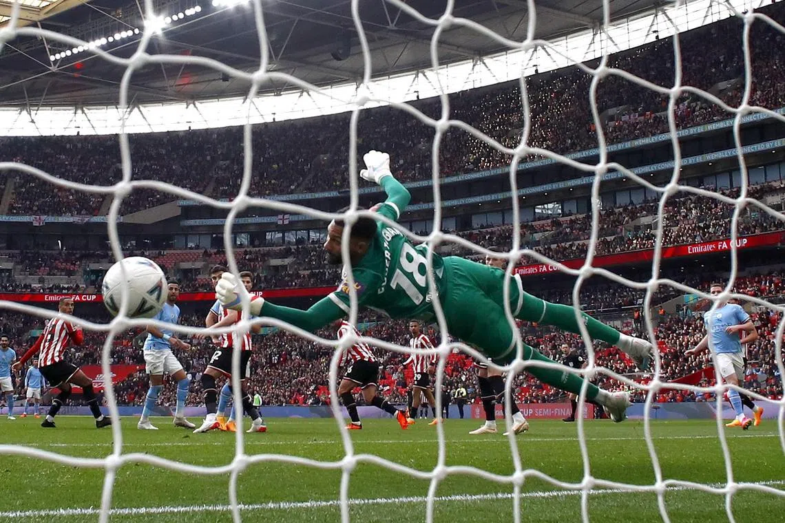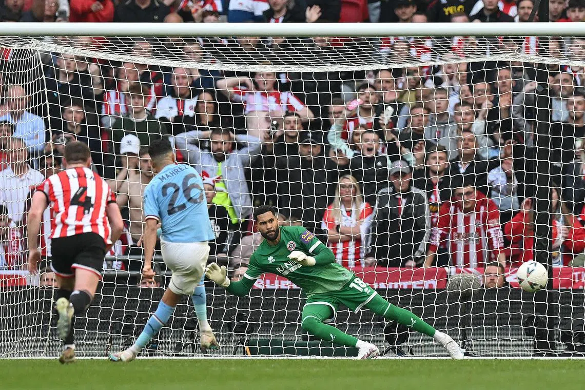 Manchester City’s Riyad Mahrez scores their third goal past Sheffield United’s Wes Foderingham to complete his hat-trick.