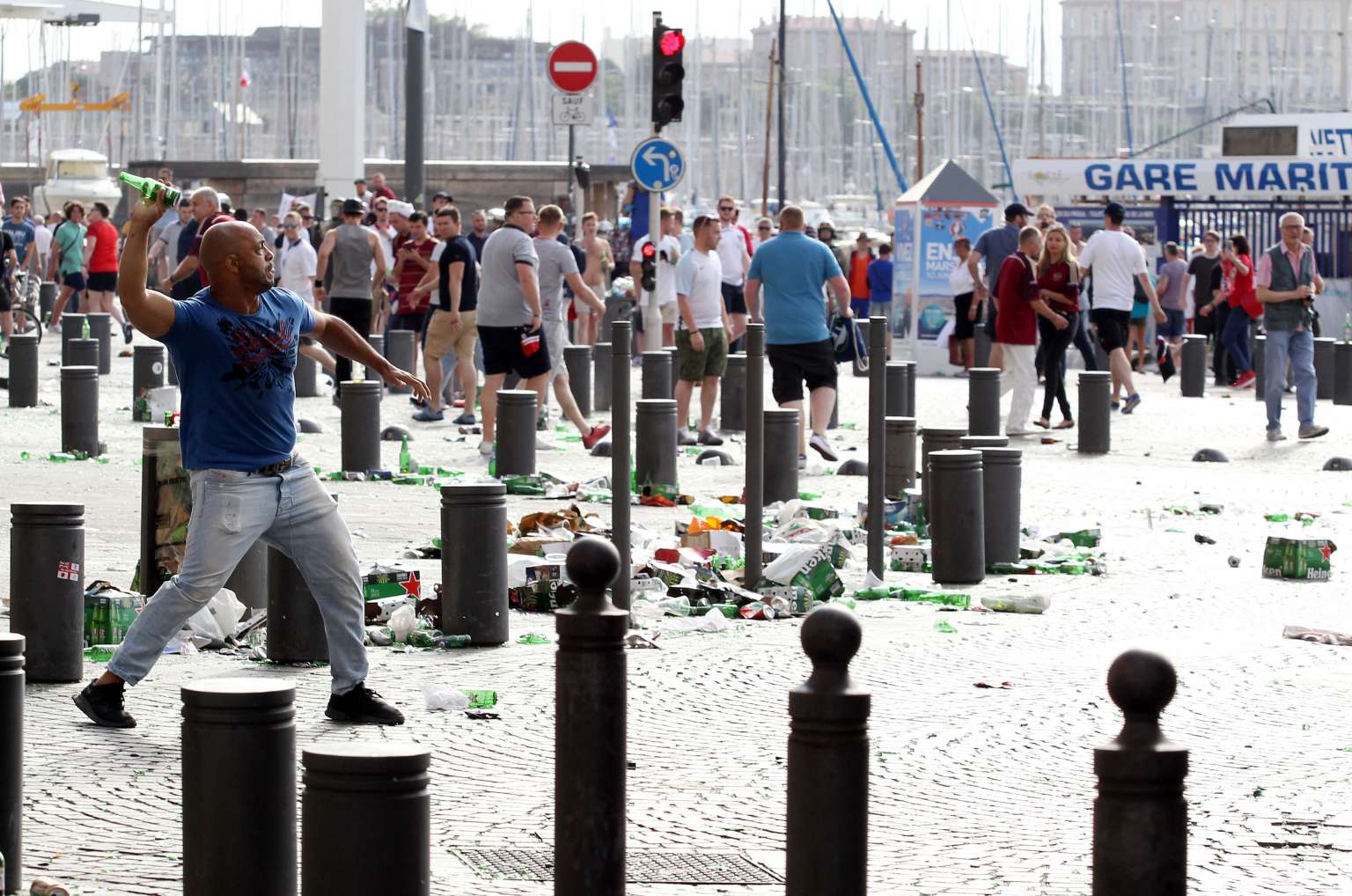 A man throws a beer can during street brawls ahead of the Euro 2016 football match England vs Russia, southern France, on June 11, 2016.