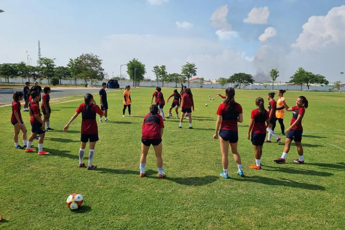 The Singapore women's national team in training at a field located at the ACLEDA Institute of Business in Phnom Penh.