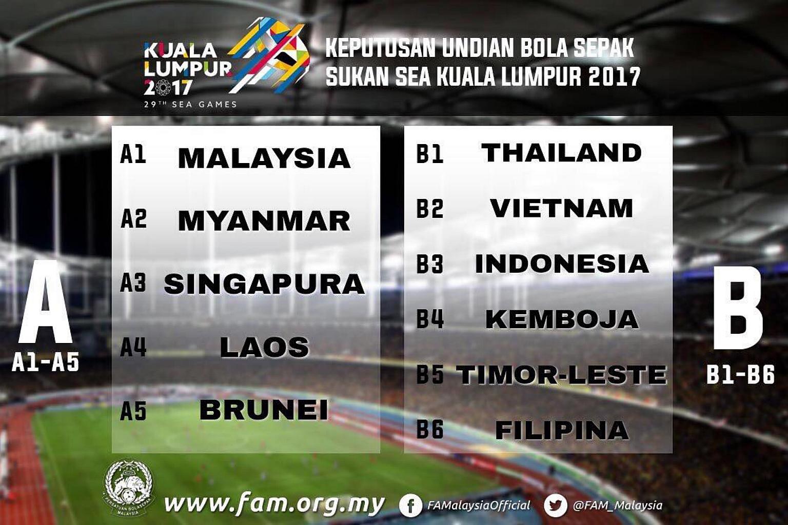 SINGAPORE - The national Under-23 team has been drawn in Group A for next month's SEA Games, alongside Myanmar, Brunei, Laos and hosts Malaysia.