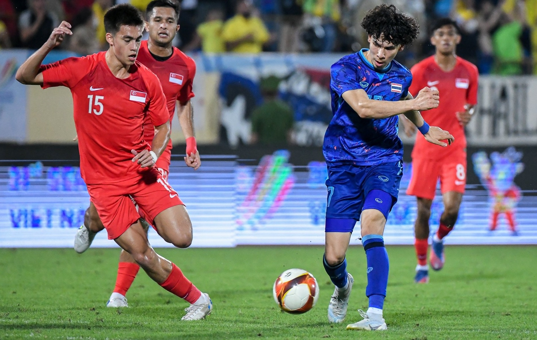 Ex-Singapore youth international Ben Davis (blue No.17) scored the first goal as Thailand thumped Singapore 5-0 in a football match at the Hanoi SEA Games on 9 May 2022.