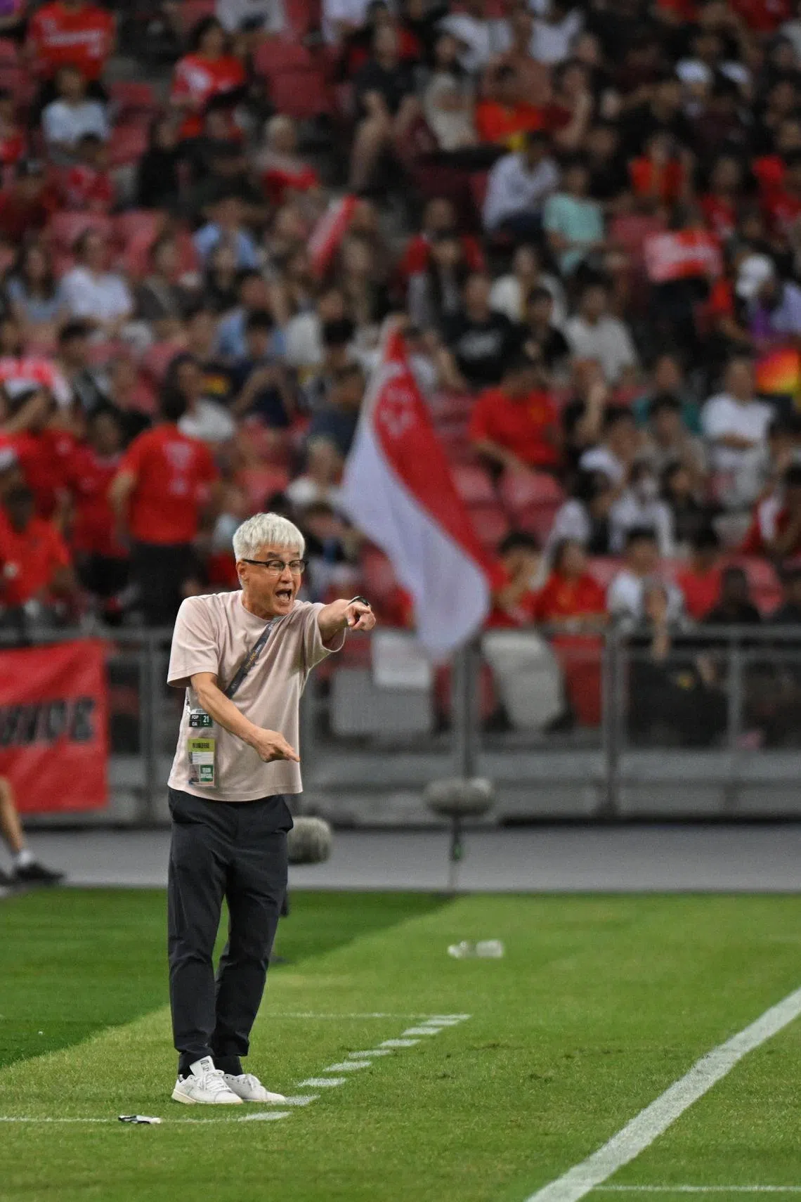 Singapore head coach Tsutomu Ogura yelling instructions during the World Cup and Asian Cup second-round qualifier against China at the National Stadium.