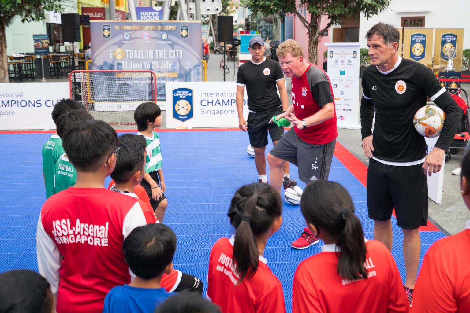 FC Bayern Munich youth coach Thomas Doellner (in red) conducting a public clinic at the Fountain Square in Clarke Quay on June 11, 2017.