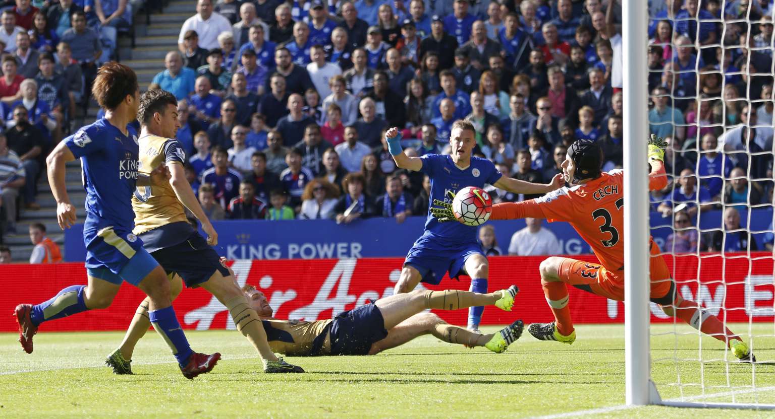 Jamie Vardy scores the first goal for Leicester City at King Power Stadium on Sept 26, 2015.