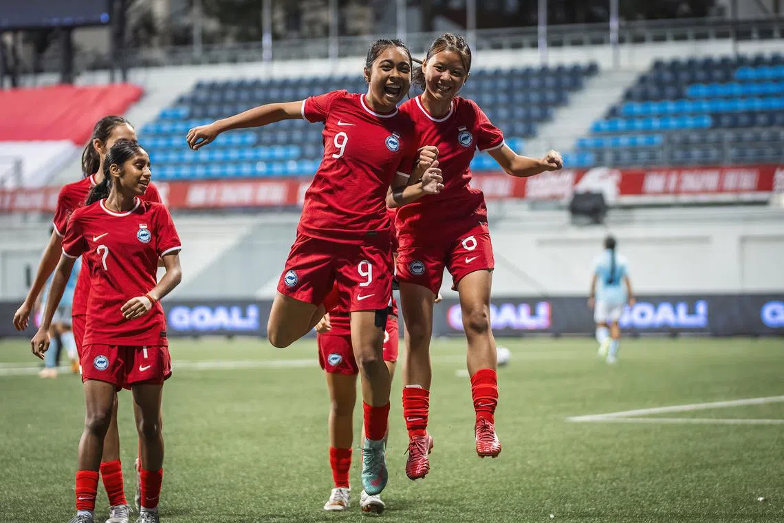 Striker Nur Ain Salleh (second from right) celebrates after giving Singapore the lead in the 2-0 win over Cambodia in the Lion City Cup on July 12.