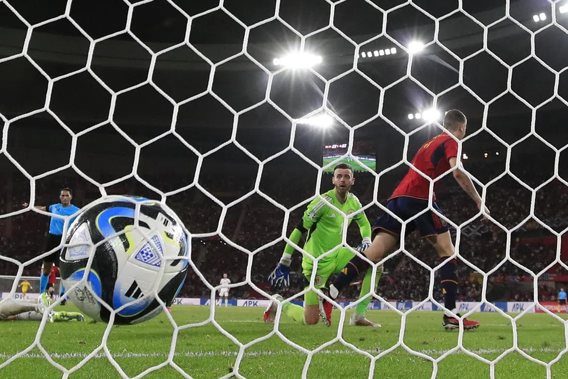 SEVILLE, Spain - Alvaro Morata’s diving header and a scrappy Oihan Sancet goal earned Spain an important 2-0 win over Scotland in Euro 2024 qualifying on Thursday.