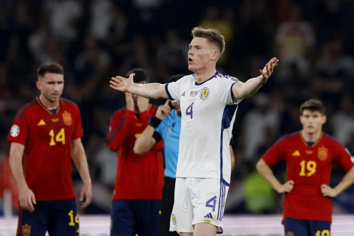 Soccer Football - Euro 2024 Qualifier - Group A - Spain v Scotland - Estadio de La Cartuja, Seville, Spain - October 12, 2023 Scotland’s Scott McTominay reacts after his goal is disallowed after a VAR review.