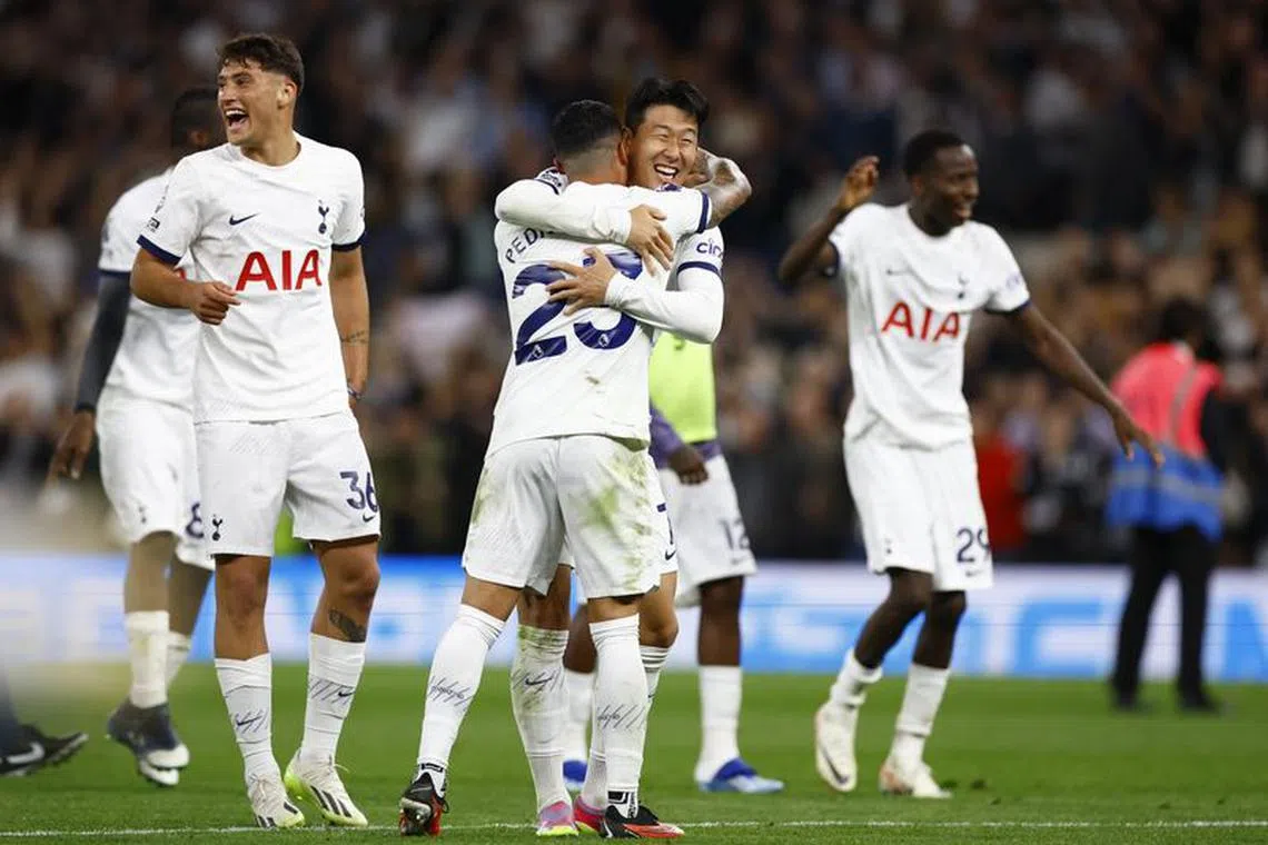 Tottenham Hotspur's Son Heung-min celebrates with Alejo Veliz and Pedro Porro after the match.
